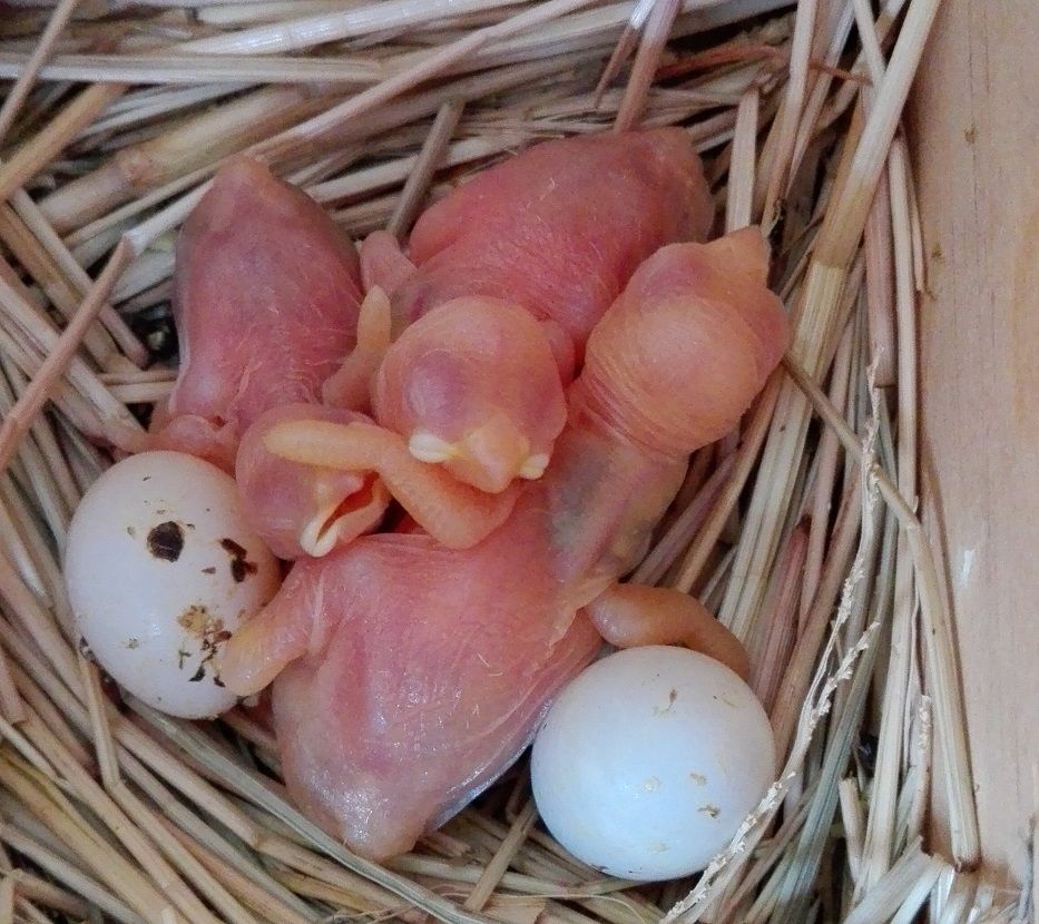 I checked on my baby Javas as the floor of my aviary is soaked (it's got a thick lot of wood chips in the bottom) but everyone seems fine. They are huge now. The oldest is 6 days old today and the youngest is 4. Still no sign of feathers but they are a big finch so they are slower to develop than the little finches. My DD wants to hand rear them but I might just steal the two eldest ones and leave the parents the youngest one to finish rearing.