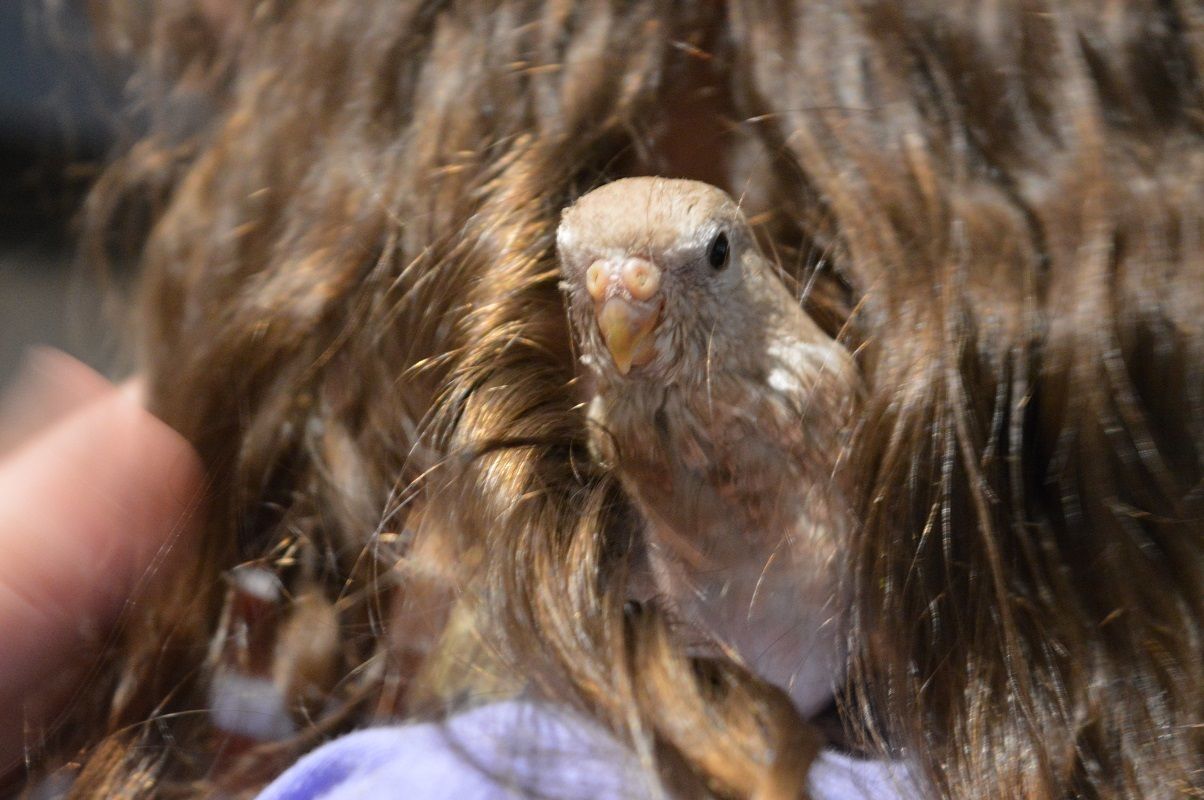 Rosie likes to snuggle into hair and preen it for you. She's on my DD here.