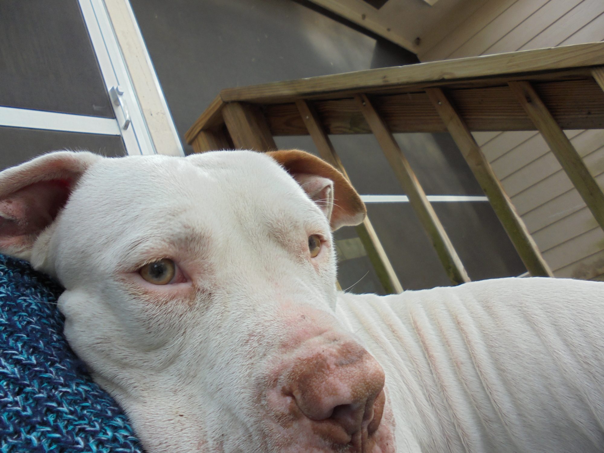 Still have the "found" pup, the shelters around here are full (unless you want them to euthanize and we don't). Here's the big sweetie! He likes to cuddle. Earlier today he was trying to sit on my lap and wouldn't fit so he settled for leaning on me.