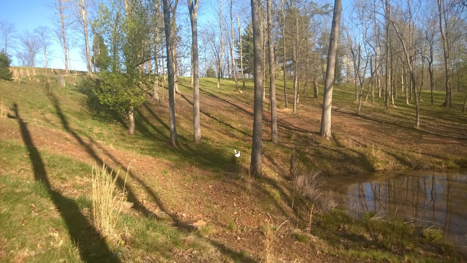 :gig How bout a chick pic? This was the first lav orp to hatch yesterday evening. I got some scenery pics from camp this past weekend for you too. Part of the pond. I took this from the driveway, it wraps beside and up above the pond. See the 2 ducks in the center of the pic? Behind my chicken coop, looking out over the valley that runs behind our place. Same direction, just a little further down the yard opposite direction, the front yard... still working on getting the grass to grow well, after all the dirt he moved