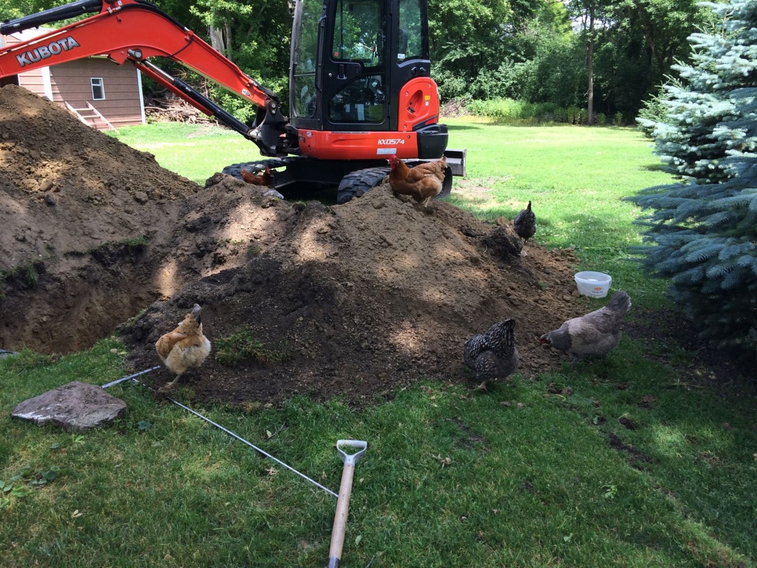 Good morning WV! The girls in the pictures are 2 barred rock, 2EE's, big girl on top of pile is a red ranger and girl by back hoe track is a production red....I have 16 hens total