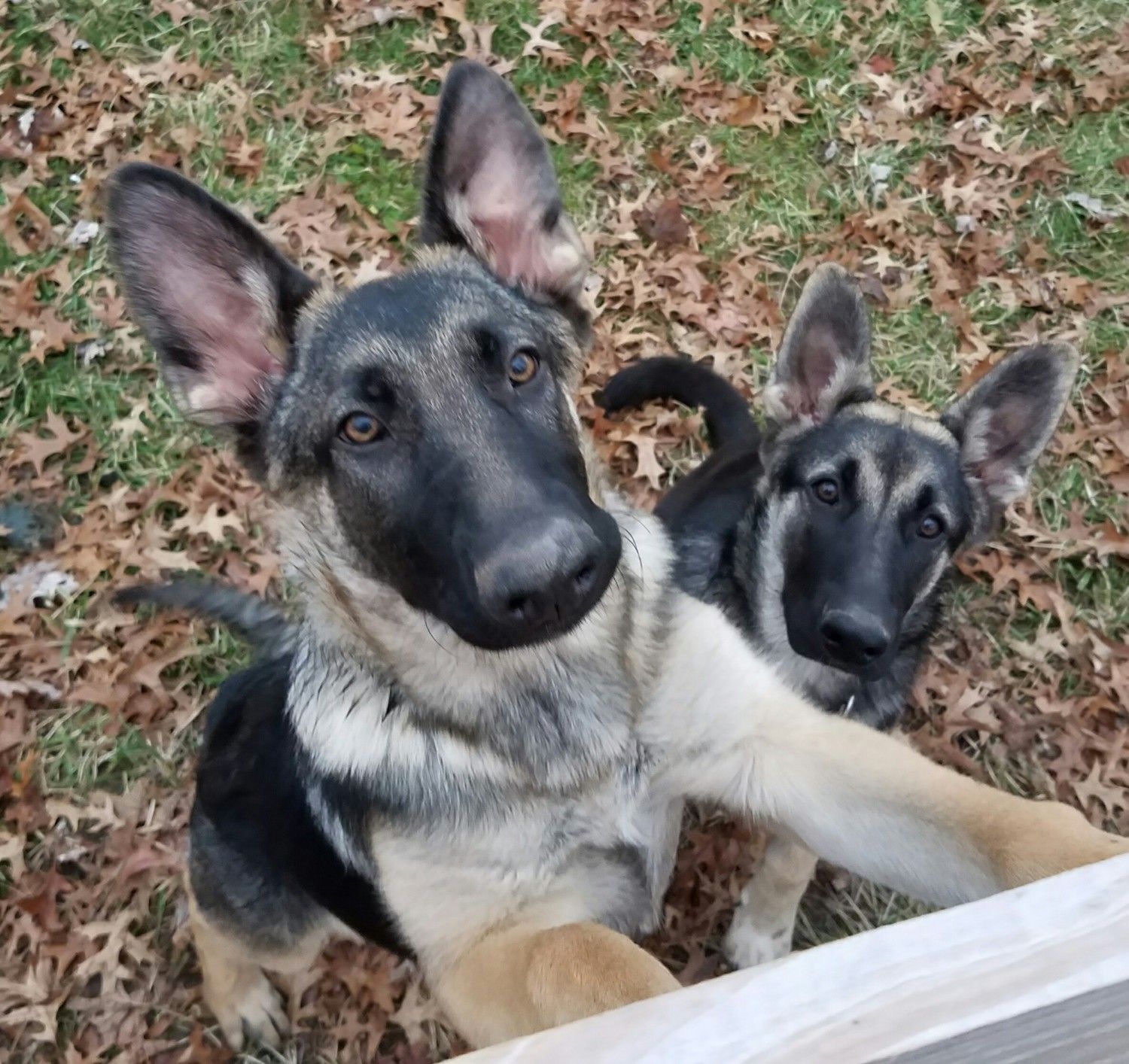 4 month old Ginger in the front, 5 month old Eden in the back. Eden is 1/8 wolf, the only difference I can tell is a stronger intensity in how she listens and responds, very in-tune.