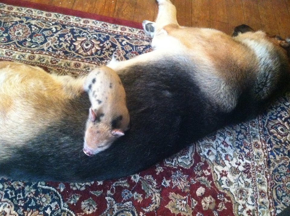 Logan is hands down one of the best Shepherds I've ever had, totally sane and loyal, likes all animals except cats that aren't his. Here he is with Priscilla the pig when she first came home. He also shares his food with rescue kittens and gives the puppies whatever they want. LOL