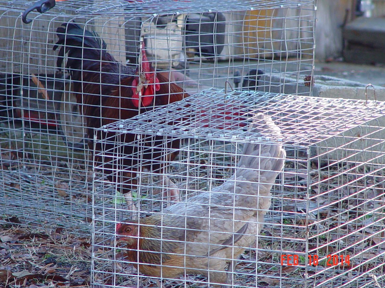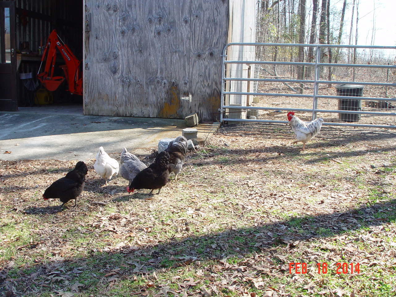 New chicken tractor condo. Barred Rocks and the little red headed hen from next door. She has a crush on the rooster.