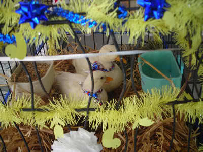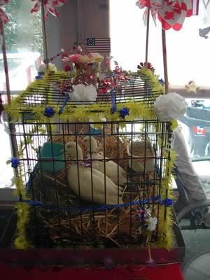 I don't have any doves or even pigeons for that matter, so I substituted a pair of white Calls. Other than them gossiping before the wedding was even over, they did purdy good. I loved the red, white and blue theme...both our flags colours!