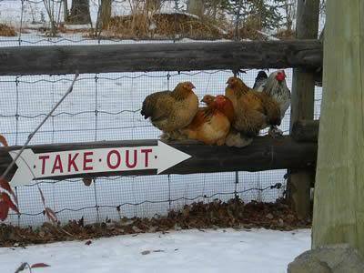 BTW, Rick liked the hole under the fence so much, he had me make up a sign (pond photo, top far right and below with lounging yard birds) so the yard birds that crossed over knew the way back home...could be KFC related too...or not...