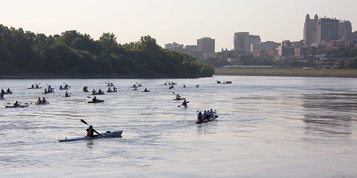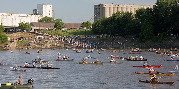 As I was preparing to return home, I entered the world's longest non-stop canoe race. The 'Missouri river 340'. It is 340 miles from KC, Kansas to St. Charles, MO. Most racers had a ground crew for supplying food and water. I didn't and had to carry everything in my slow whitewater cargo barge, an Old Town Appalachian open canoe. 150 boats entered the 100 hour race most of whom were well conditioned canoe/kayak racers. It was extremely hot with brutal headwinds and along the way about half of the entrants dropped out. The only training I did was a single 18 mile paddle and 1 mile swim the week before the race.