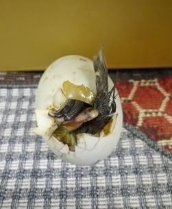 It gets serious when they tear out chest down and cover the growing pile up of eggs after they leave...of this clutch, she laid nine eggs. I candled them and five had chilled & were clears--1st timer hen. So she hatched the four (cover thine eyes--no eye contact with the FTDuckling monsters...like Medusa--maybe best use a mirror to read this post!).