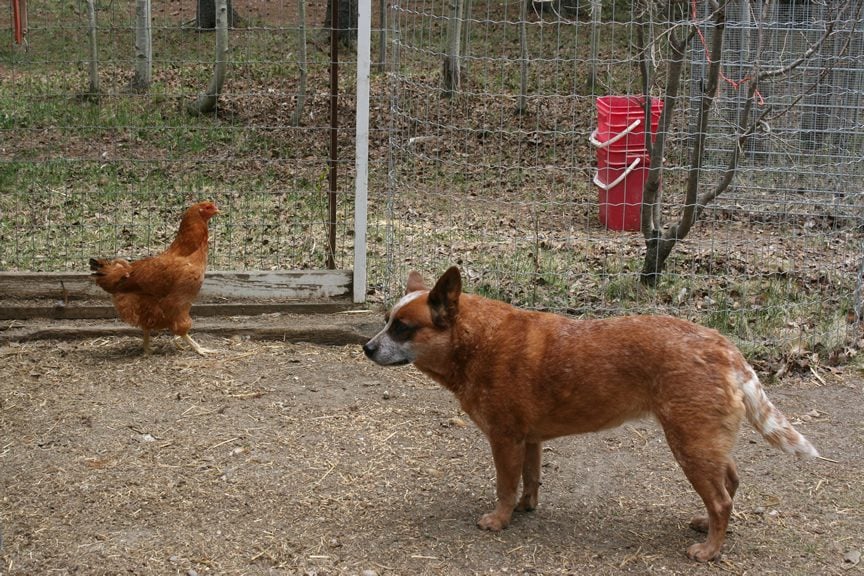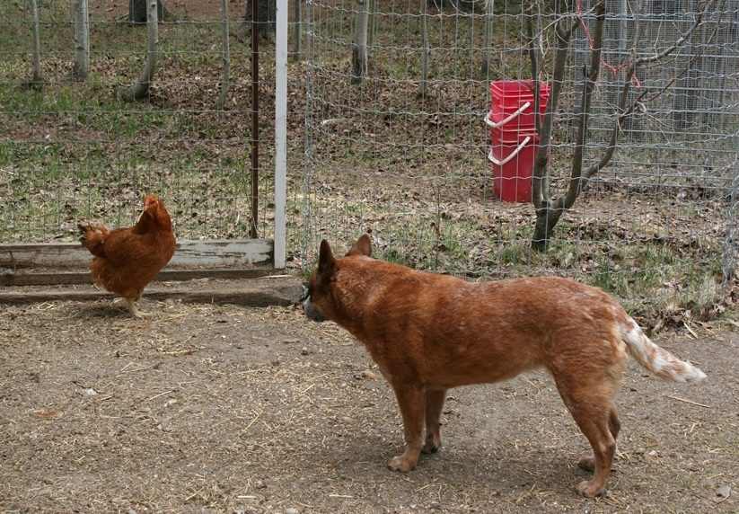 Red chicken and Red dog give each other the EYE...tough dog, tough hen!