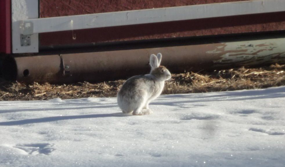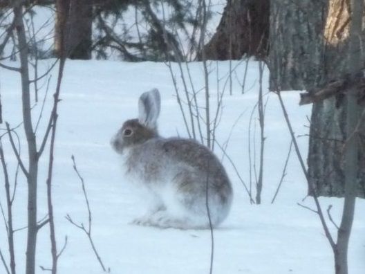 Wabbit...on Friday morning, Rick exclaims, "Why there's the rabbit!" so I run and grab the camera, toss on shoes and off in hot pursuit of the bun buns...Rick says as I roar out the door..."You'll NEVER catch it!" with me having visions of Alice in Wonderland but this bun was not white no mores...Rick said he was changing coats! Great sign of spring approaching...coat colour to change!