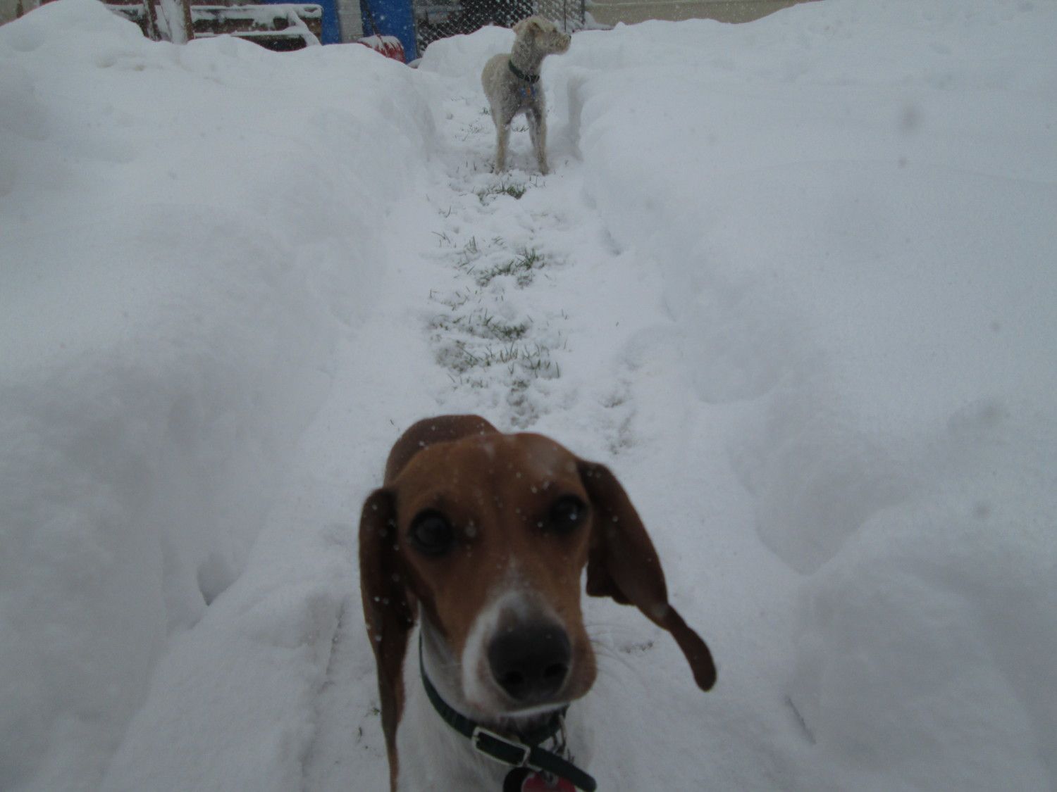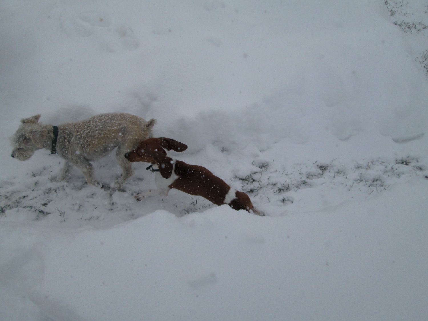 Here's what we go all last night, and will keep snowing all day and into the night! My little dachshund's first time in it!