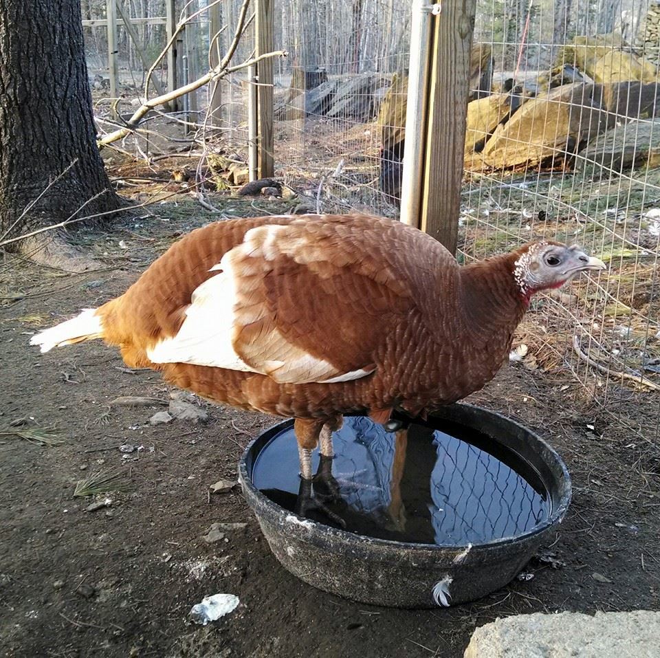 ... it was 60 for a high. It was probably 55 when this turkey jumped in the water after I refilled it. Doesn't she look miserable in the heat?
