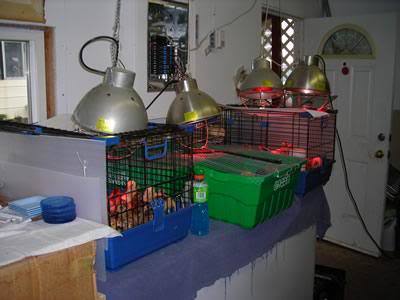 I use what I label "rodent" cages (pictured below with the blue bottoms and privacy tenplast pieces on sides) after they out grow the green bin brooders. I have three and think they are intended for gerbils I guess?? They are now located on a shelf on the back wall of my hallway in the Duece Coop. I have sturdy metal hangers for the heat lamps to be suspended from with added security strings should something go wrong. Heat lamps are tres dangerous and can cause fires easily!