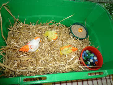So out of necessity, I looked at the green grocery store shopping bins and thought, those would work rather handy dandy. Good shape for economic shelf use, good shape for food/water one end, heat the other, not too large, cheap cheep (five buck?), easy to clean, can stack together for storage...yuppers...I was sold on so many levels!