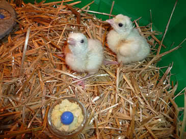 I find the bantam Call ducks to be the most tender of the babes and they require the most "brooder" time. Once I see some feathers on the chest, they are good to go outside in the Duck Barn (with no heat) and deal with whatever weather is thrown our way. Turkeys and chickens are far more resilient than Calls but I would be terribly disappointed if I was producing fist sized turkeys and standard chickens...har har. I think the more exhibition typey the Call, the slower the start but they ramp up pretty well and are surprisingly tough ducks as adults. FTD!