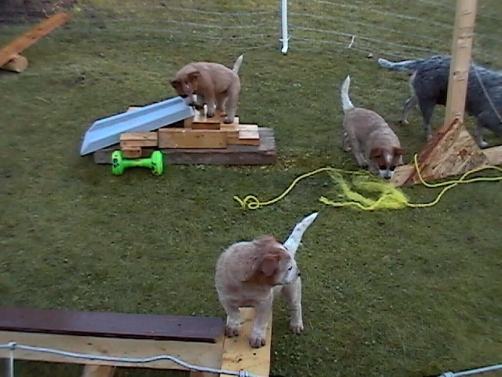There was a tire suspended for jumping thru, balance beam (bottom of photo--Fixins' bro is about to attack it), teeter totter (far top left...just a plank and a round rolly chunk of firewood)...the slide...tunnel and water hazard (more like shallow drinking bin you could climb in!).