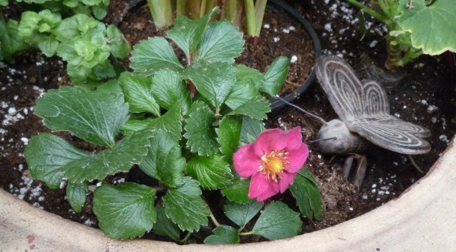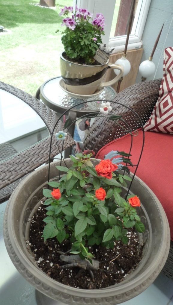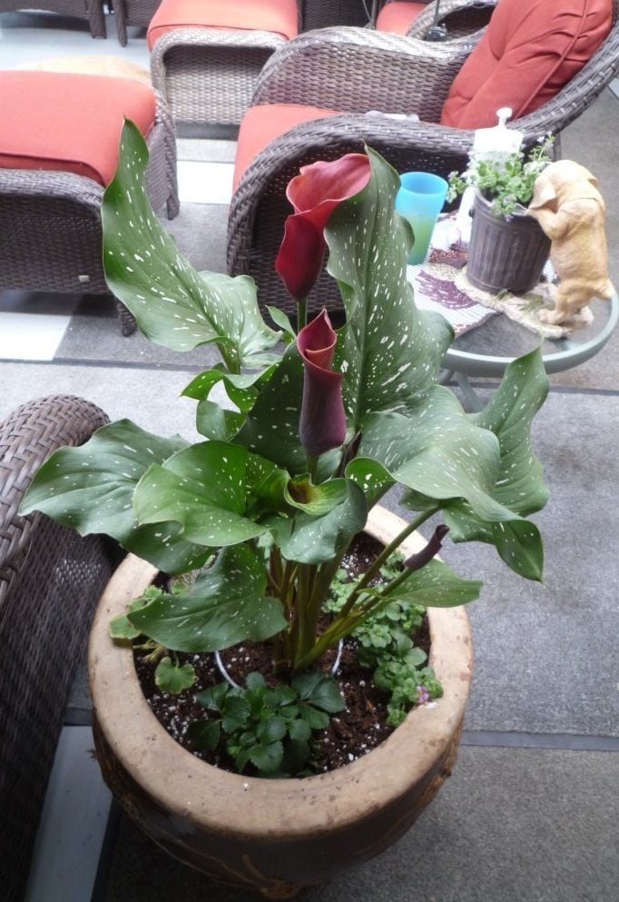 I decided on a Cala lily with pink petalled strawberries and a pink geranium for the dragon pot in the Man Porch. I whined at a friend that studies horticulture/worked at garden centers and she set me straight. I was repotting the Calas when I bought them and she told me they like their roots confined and will grow to fill a pot before flowering...so I just sunk the pot as is where is and the lily has been going great...two new flowers coming up now.