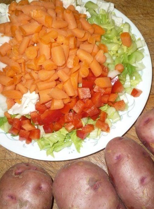 Got pretty much all the veg sliced and diced up...just the potatoes to slice up thin and maybe add some corn to make sure we have enough STARCH in our diets (Die with a capital T).