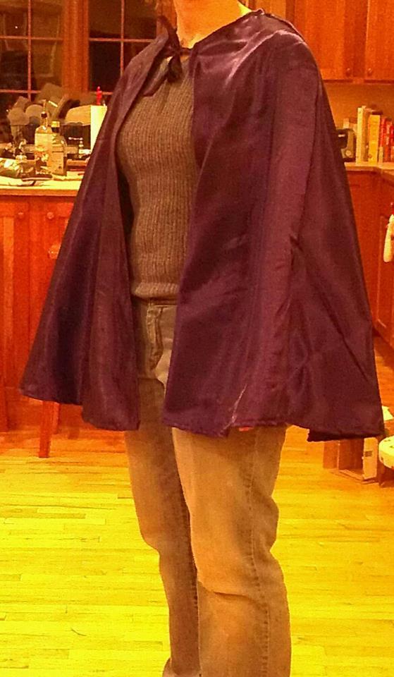 And I got one of the 2 capes done (with exception of the "A" on the back). One purple kids' superhero cape, modeled on a very tired human adult.