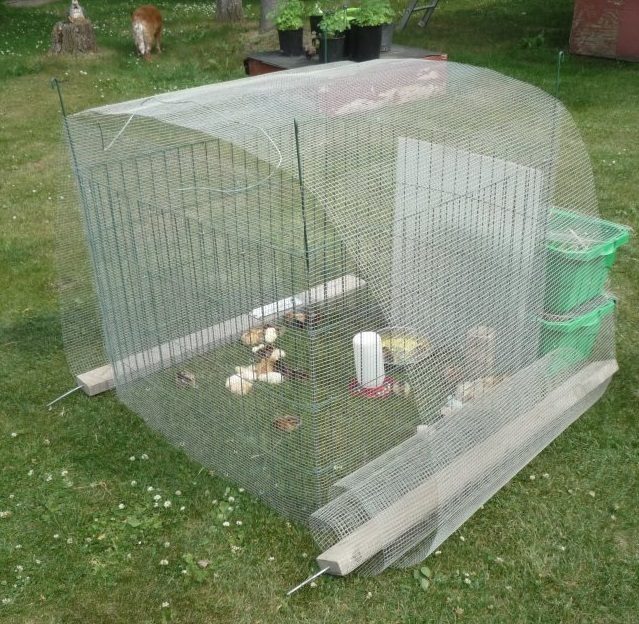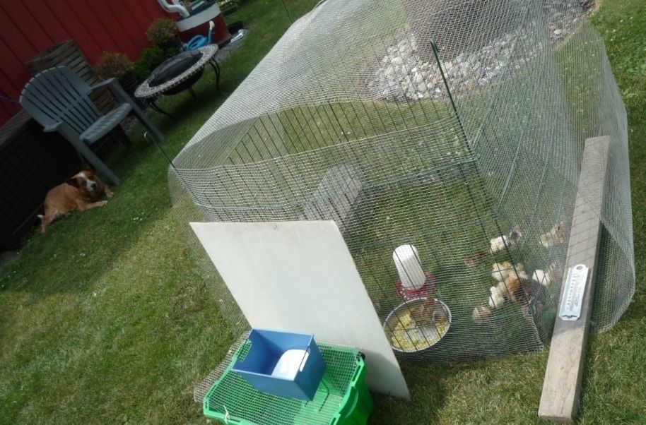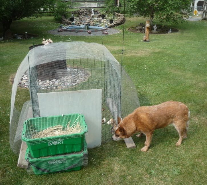 These are powder coated composting wire panels...were on sale a few years back and I c-clipped fine meshed hardware cloth cut to fit each panel and voila...I have about 12 panels and can make up all sorts of configurations for day olds (and older) to be out and about on the lawn...soaking up Vitamin D from the sun and learning to be chickens...REAL chickens out and about in the REAL world...but not too real...no running mad dashes from predators...not with the Guard Dog on Duty.