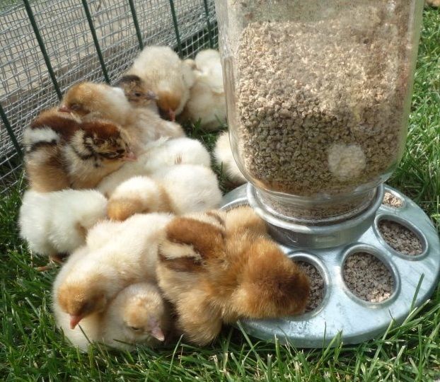 Glass tea light holders make excellent dispensers for water (with marbles to prevent wetting the youngsters too much) and starter &/or boiled egg yolk (I have lots of duck eggs, so was duck yolk this time) with a marble to entice pecking at the "shiny!" Note that I have rubberized cupboard liner in the bottoms of the containers to ensure good footing.