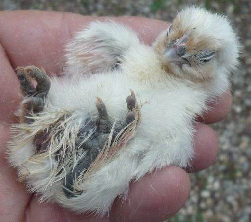 Because I KNOW the variations in skin colour are easiest to spot when the feathers are damp...this one is not even hatched outta the egg (likely a female...all the really darkest ones (with potential FM) have been of the gentler sex likely due to id"+" being gender linked but should we double up in the males--no telling how long dark pigmented skin = only the girls!) to show instantly the portion of the wing that is PINK and not DARK skinned.