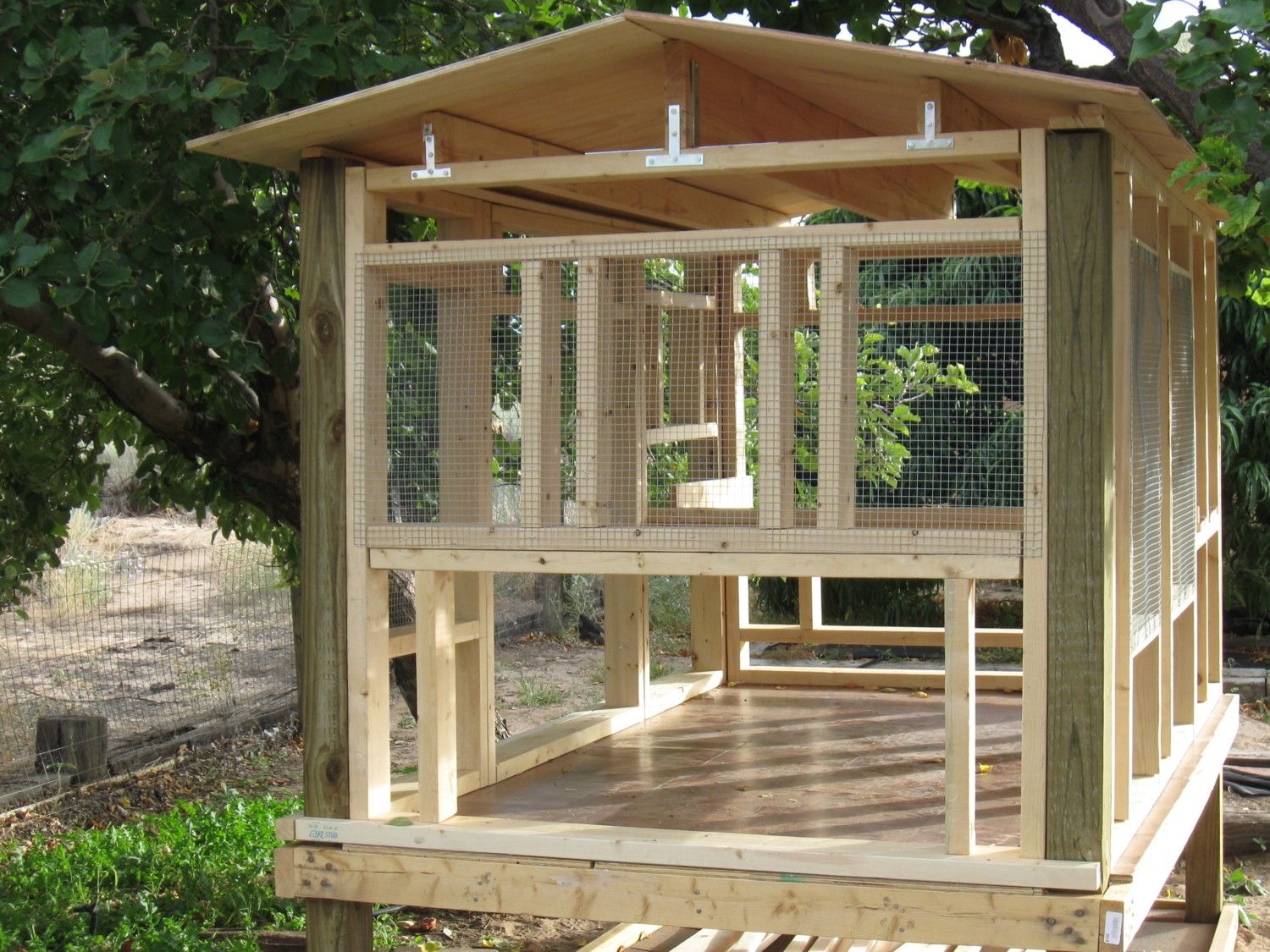 Today was putting in the beams and putting on the roof. Roof felt and shingles will be a finishing touch, so please don't think my birds only will have a raw wooden roof over their heads. The roof was a challenge because I had to take into account the tree limbs which provide the shade and accommodate for them...plus they were rather unyielding when getting up under them to put the structure in place.
