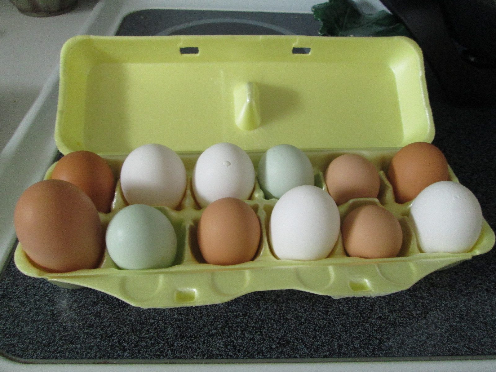 yikes, my Ameraucana laid a huge one like my NH today..they were both big today. The NH didn't lay yesterday, I didn't expect her to after that big egg, but she laid another big one, then I go out to find this blue egg..first, the pic of the NH in the carton, then the two beside each other.