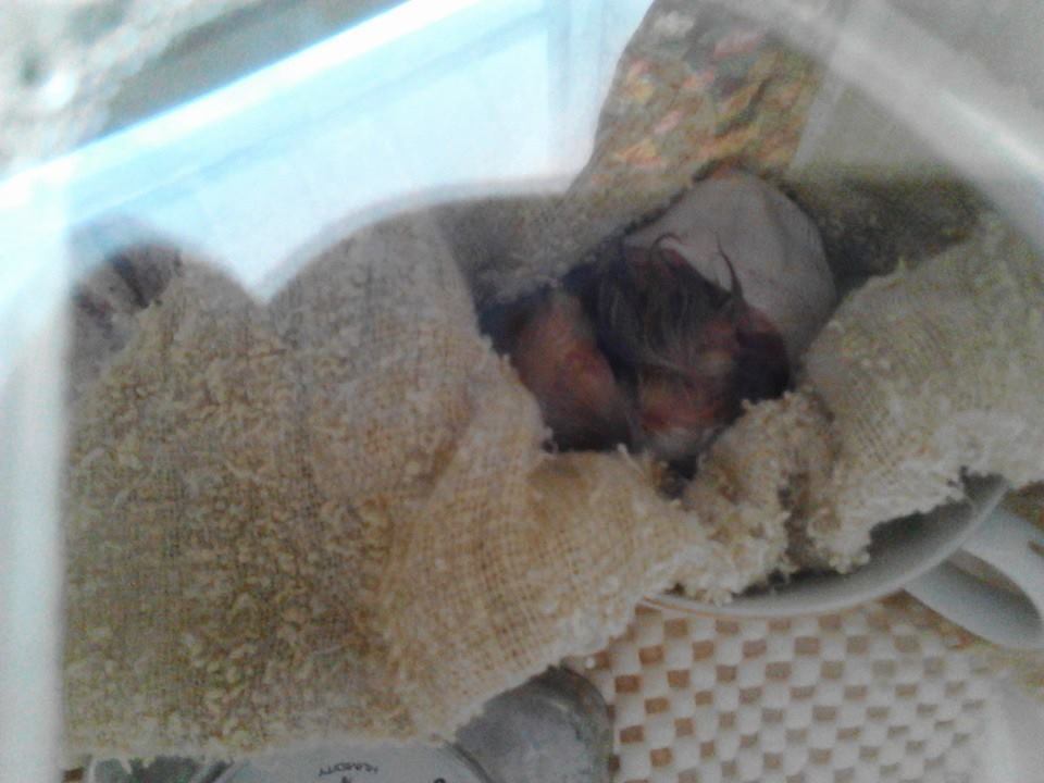 I heard it peeping and checked the bator and it had pipped so I dampened it and stuck it in the other bator. Well no progess since this morning and it should have hatched two days ago. So I helped it and now it is in a tea cup asorbing it's yolk. And thanks to y'all it is doing better than any I have ever tried to help. YEAH!!!