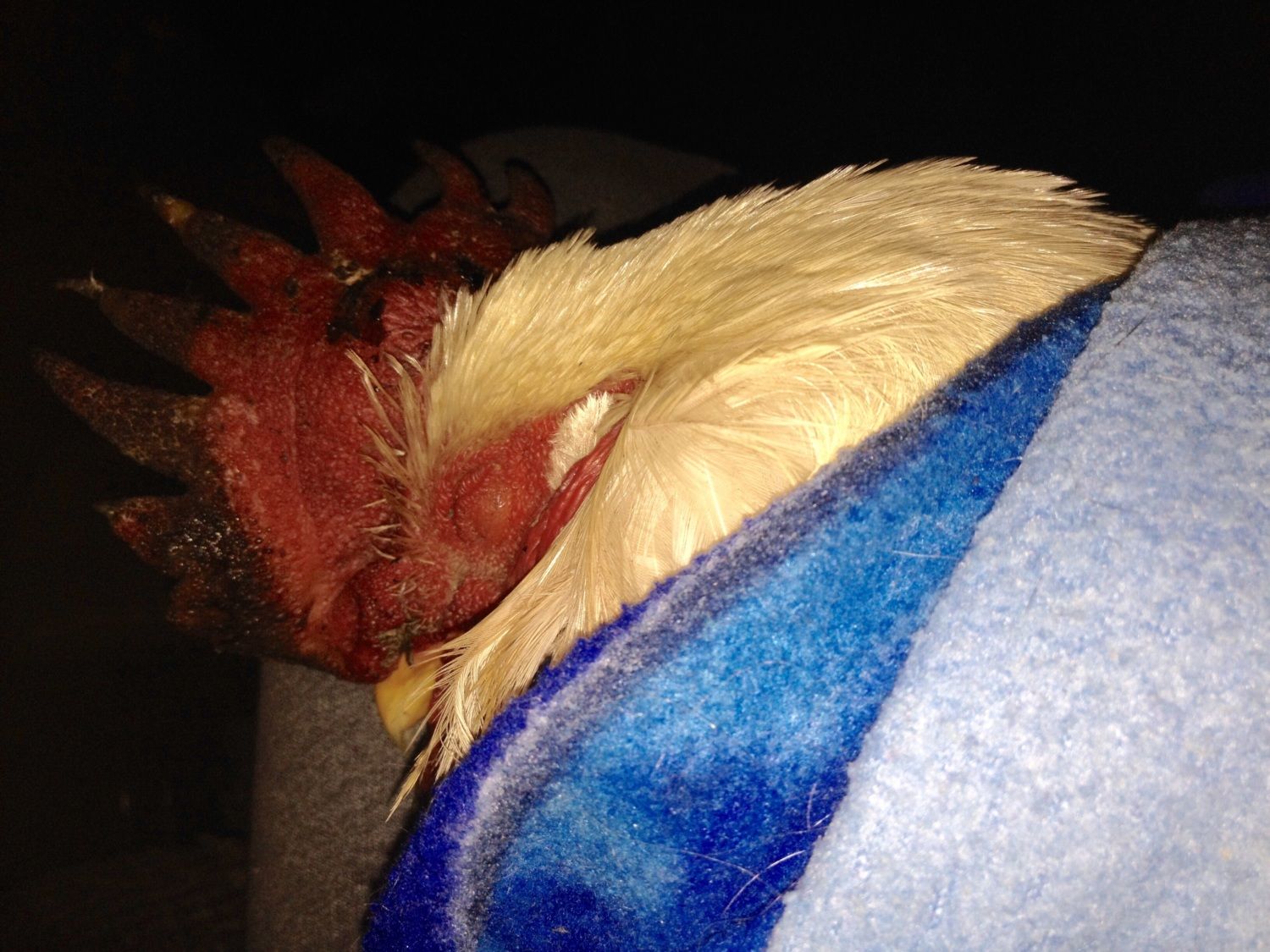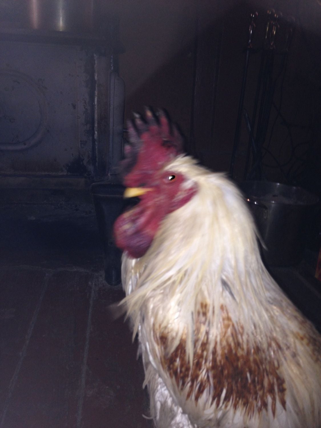 Poor Dobby got frost bitten badly last week and though I've been keeping an eye on him and it seemed to be getting better this morning DD found him on the floor of the coop covered in blood. His wattles are swollen and either he was attacked by the other roosters or he tore it scratching because one wattle is ripped open. The other looks infected. He was also muddy from head to toe. I brought him inside and gave him a warm bath and then poured peroxide in the open wound. He won't stop shaking his head unless I am petting him. I sat in front of the wood stove with him until he was mostly dry and then hand fed him the rest of my breakfast...eggs, grits and half of a banana. He drank a lot of water. He's now asleep in the living room in a big box with a blanket draped over it. He ate some chick crumbles and some of my greens for dinner.