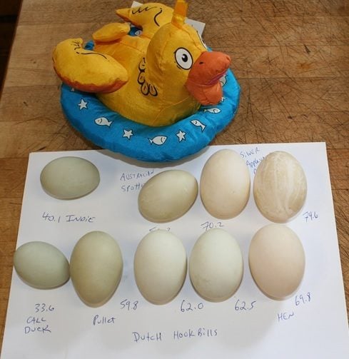 I have the theory that while the adult female bird (not pullets and cockerels, but hens/ducks and cocks/drakes) will produce a larger egg in their second year than they did in their first, there is NO real firm correlation between egg size and adult size of the bird...yes, a bigger bird outta the egg often seems more hearty but in the end adult size of the being is sorta like puppies...they all kinda are the same relative size from birth, but the Great Dane keeps on chugging away growing whilst the toy Poodle stops growing sooner. Too small a bird and they are often sterile, so there is a balancing act...as Rick asked me "when is too small for a bantam duck an issue?" Well the thing about that is if you make them so small that they are sterile, that kinda ends that...not making any more, so it fixes itself and they go extinct since we are not into cloning, eh?