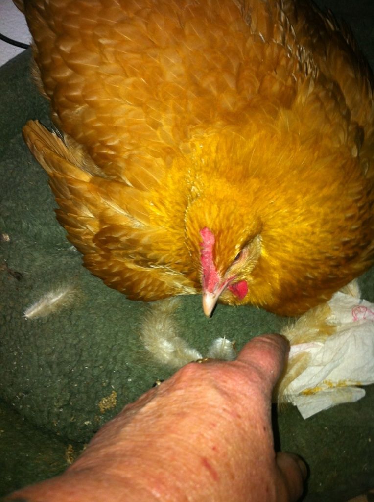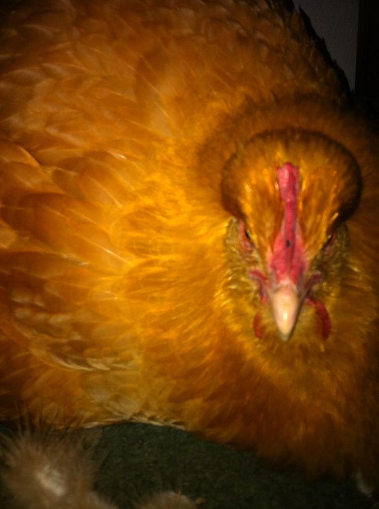 Punkin the Night-time House Chicken just went broody in the dog bed under the TV table.
