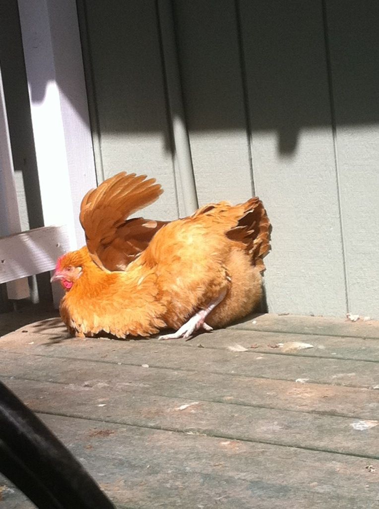 In the next photo, Punkin is sunning on the deck. She would come back INTO the house during the early afternoon to lay her egg in the dog bed. Until yesterday, she'd go back outside again and not come in until Coop Up time. Notice the feathers in that dog bed? I thought she was just preening there...