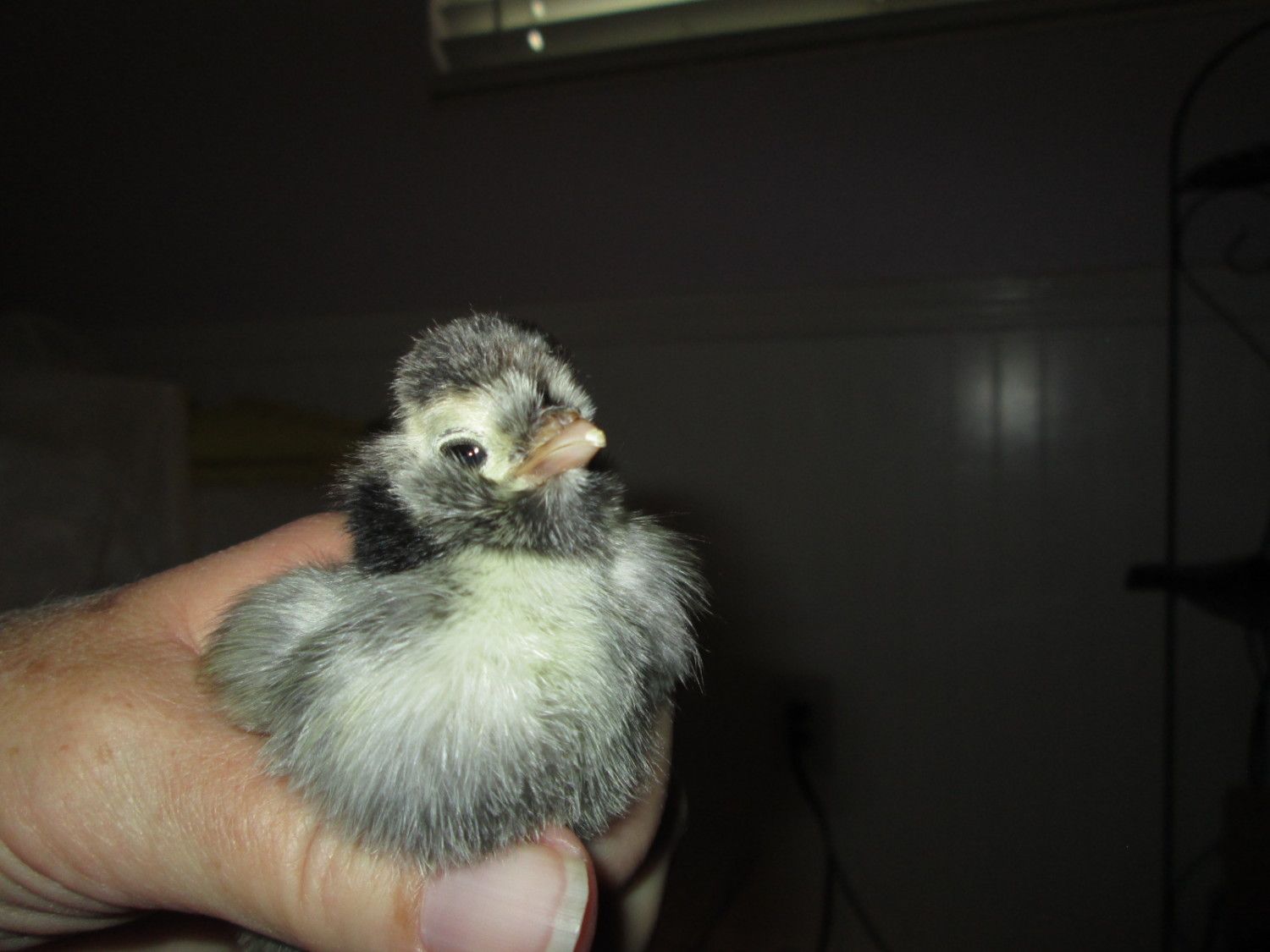 Over the years, I've had so many of them get about half grown, and suddenly one day wind up unable to stand. It's that vaulted skull, I hear - apparently, another bird pecks them on the head and the brain is just too vulnerable. If I keep the adults in an outside run, it seems like the first time their heads get wet, they start pecking at each other's crests, and before you know it, they are all bald! Right now, I have a frizzled hen that I am trying to raise some babies from, but she and the roo she's caged with have been eating most of the eggs before I find them, in spite of having food in the feeder 24/7. He was perfectly sweet until I put him with this hen, now, he has to challenge me every time I get near the cage, so I'm not 100% sure I want his offspring anyway.Cynthia12, Aaawwww!!