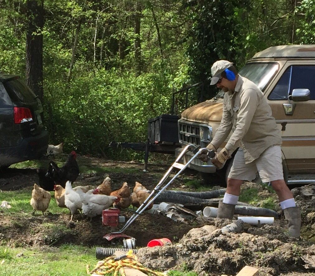 I know I know. I've been MIA for awhile...but I'm here somewhere, I think. Maddy had TCAPS this week. She did well, we think. It's hard for that youngin to sit still so long and her focus would wander and the teacher would let her get up and stretch. She wants to go to Golden Corral to celebrate next week. We'd go this weekend but I have 84 eggs on lockdown and warring roosters (again). The pigs eacaped and we spent a fun afternoon rounding them up and repairing the fence. Then one of the old clay septic pipes busted and the yard was a big nasty pond thanx to all the rain. I really wish I owned stock at Lowes. (Sigh) Here's DH and the girls digging trenches for the new septic.