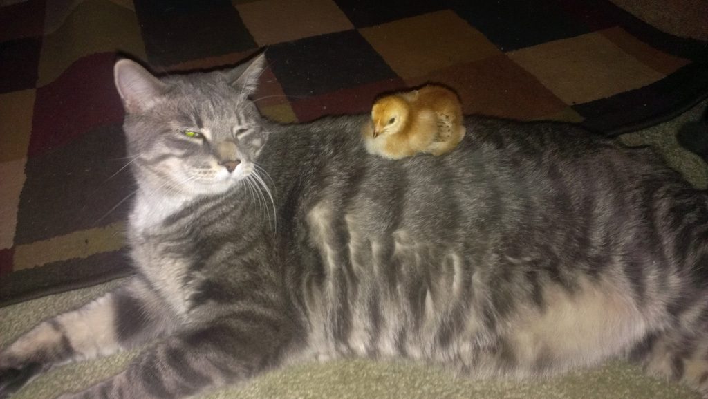 William was interested in chicks when I had my 1st ever broody a number of years ago. William weighs 15 lbs. That 3.5 lb broody Sumatra hen scared the poop out of William. He hasn't wanted to mess with a chicken again. This is the same cat I watch pounce on a ruffed grouse once. He didn't kill it, but he did have it down for a few seconds.my two cats have brought us squirrels and birds but leave the chickens alone.