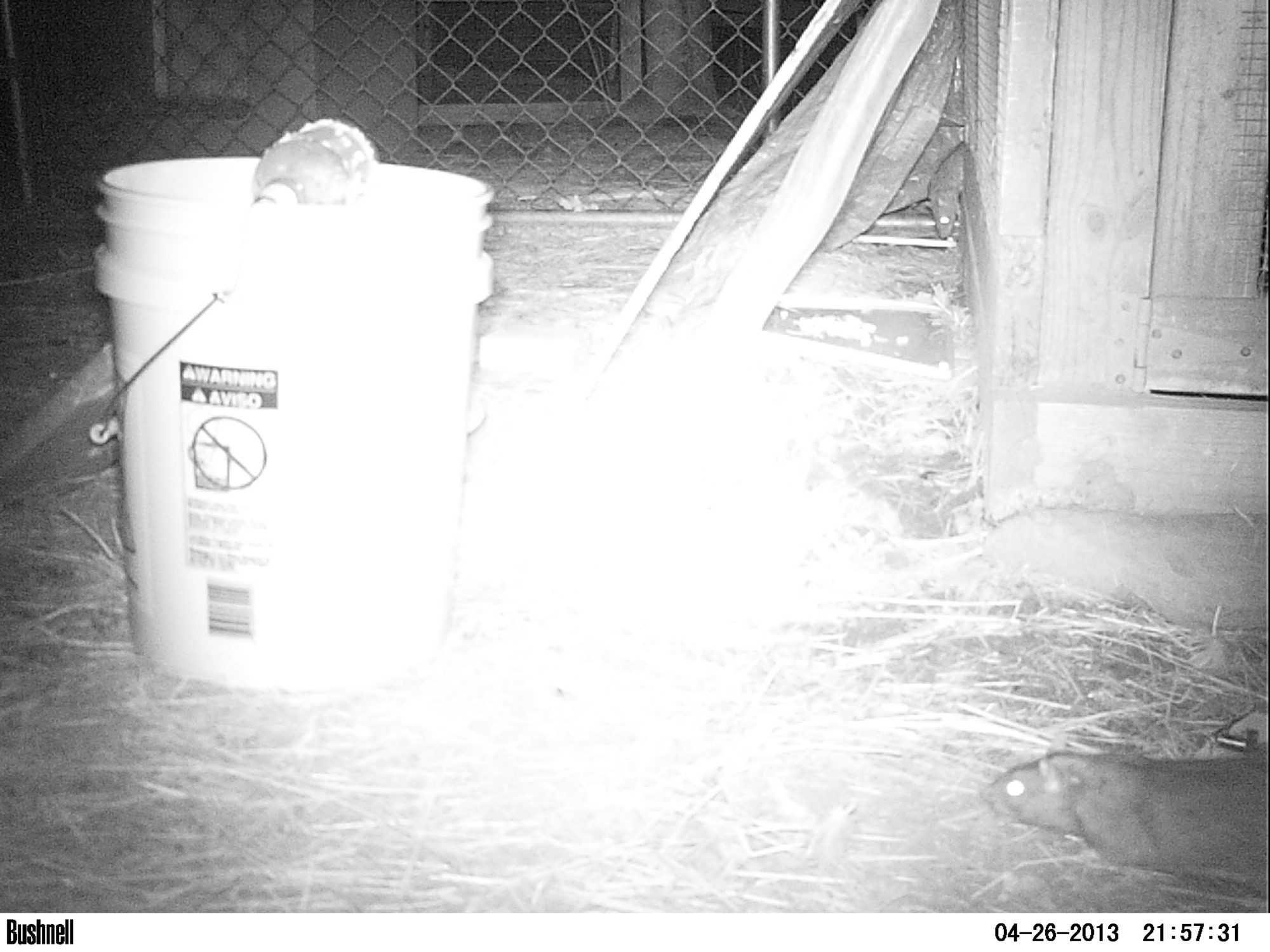 He got a shot off at it, but missed. It went under the dog house. We argued for a few minutes over whether we should attempt to bludgeon it to death or not. Verdict: Yes. Risk being late to work. He lifted, I held the shovel. The rat, already freaked out by the shot, flew out from under the dog house and ran under the goat house.