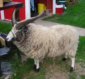 Nascor has the correct ratio of coloured to white pattern...dark feet, nose, eye patches and cape. Strong horns for a female with correct set and good spacing. Now amplify these horns three to four fold to figure where an intact male Jacob will go with these genetics for horns.