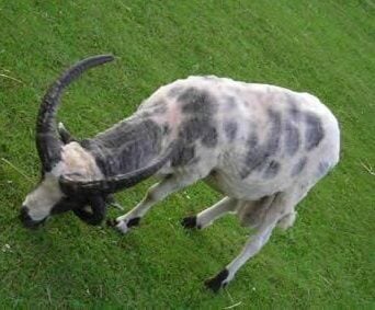 Jacob ewe and ram are polycerate (multi-horned). They are the only multi-horned sheep with a medium fine fleece that is not double coated. Horns are dark or white striped, one, two or three paired (2-4-6 horns) with preferences for even balanced sets that do not inhibit grazing. Rams are quite striking and may have horns two or more feet in length. The two horned rams may be double curled. Jacob Sheep many not be polled and both sexes must have horns though the ewes have more feminine horns.
