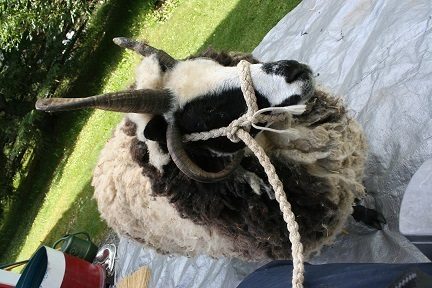 As a wether, he provides us with a dreamy, cloud soft fleece every year...I suspect that the white part of the Jacob wool is softer than the coloured part. He is way way too light, facial eye patches are absent (nose is coloured which is better than white face...too white not good- you want 40% coloured to 60% white overall).