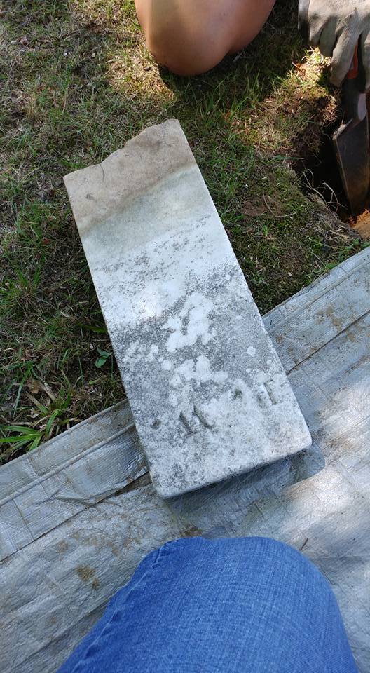 Footstone placed back in the correct orientation (headstone facing out, body, footstone facing out) as confirmed because we dug down to the broken part and cleaned with water/scrubbing