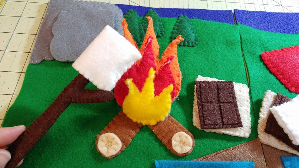 The stuff in the bowls on the table come out to make s'mores, and the sticks come out. You can "toast" the marshmallows on the stick over the fire. The fire has the batting for hot pads so it crackles when you touch it.