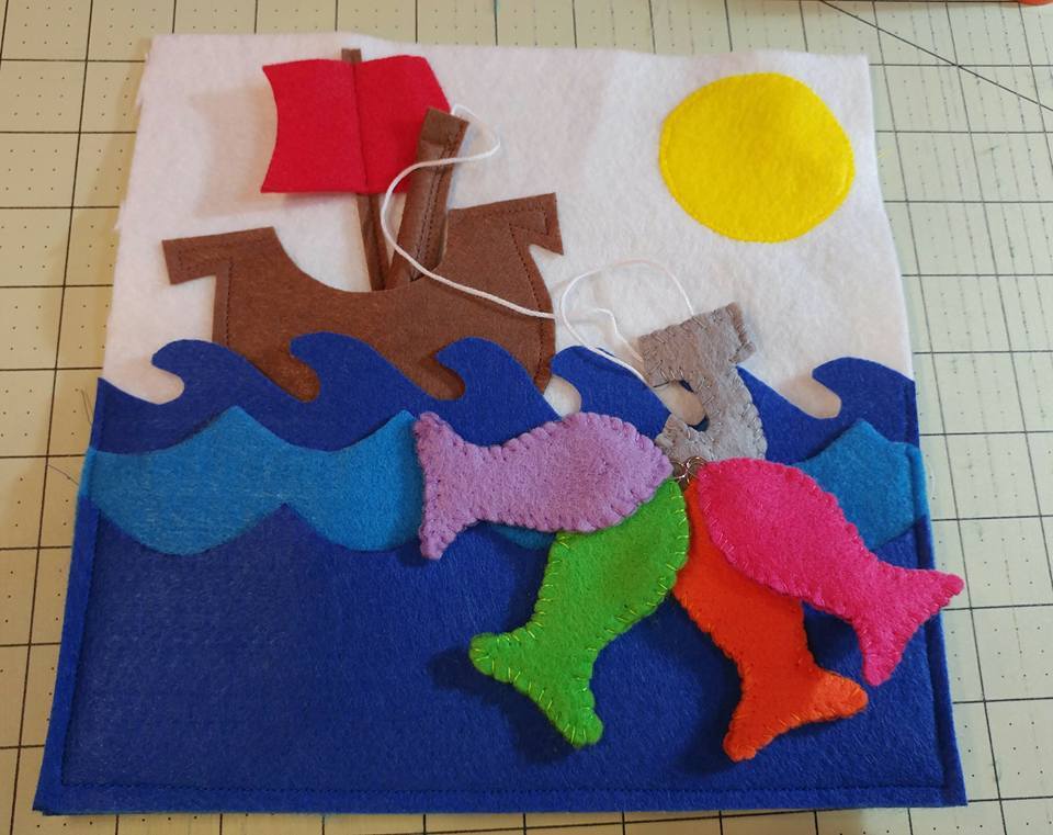 I made a fishing one - the hook has a strong magnet in it. The fish have a paper clip very securely sewn inside of them. The water is open so you can tuck the fish into any of the waves. The fishing pole does come out
