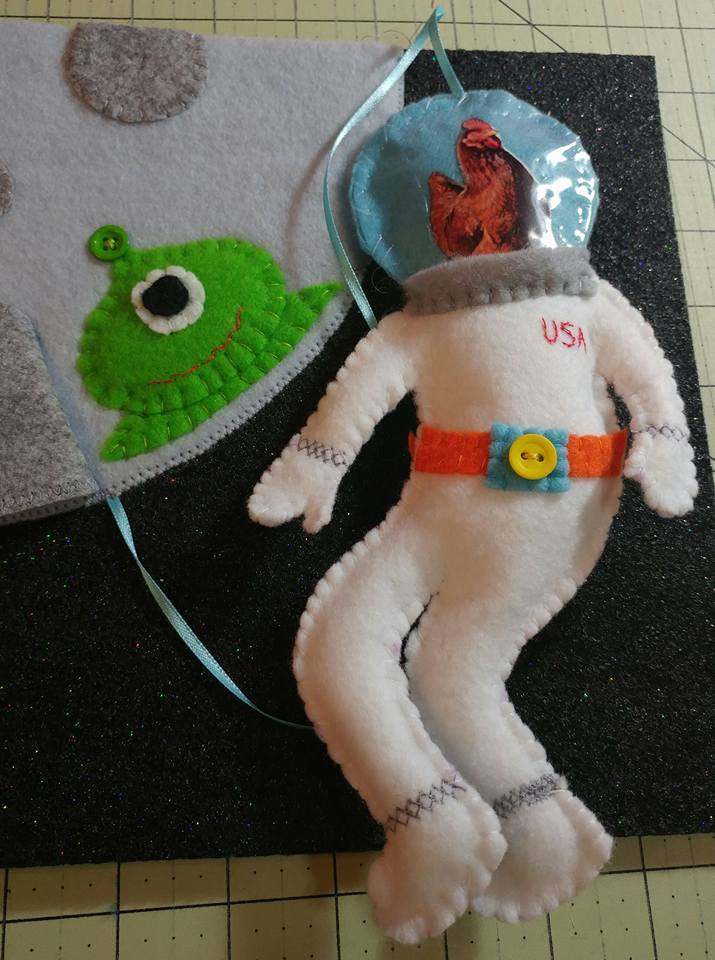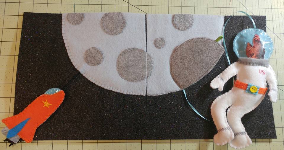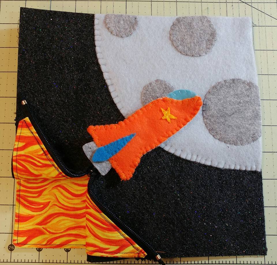 The rocket is on a zipper and opens to flames. Yes, I know my flames are sideways. I didn't purchase enough of that fabric to get them going the right direction. And how do you know that flames don't go sideways in space?