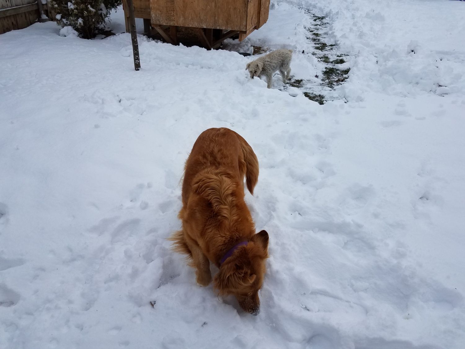 My Missy doesn't mind the snow for now. Ziggy, the Schoodle in the back is staying on the path.