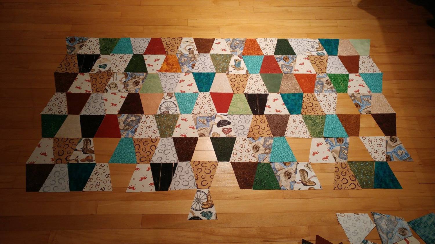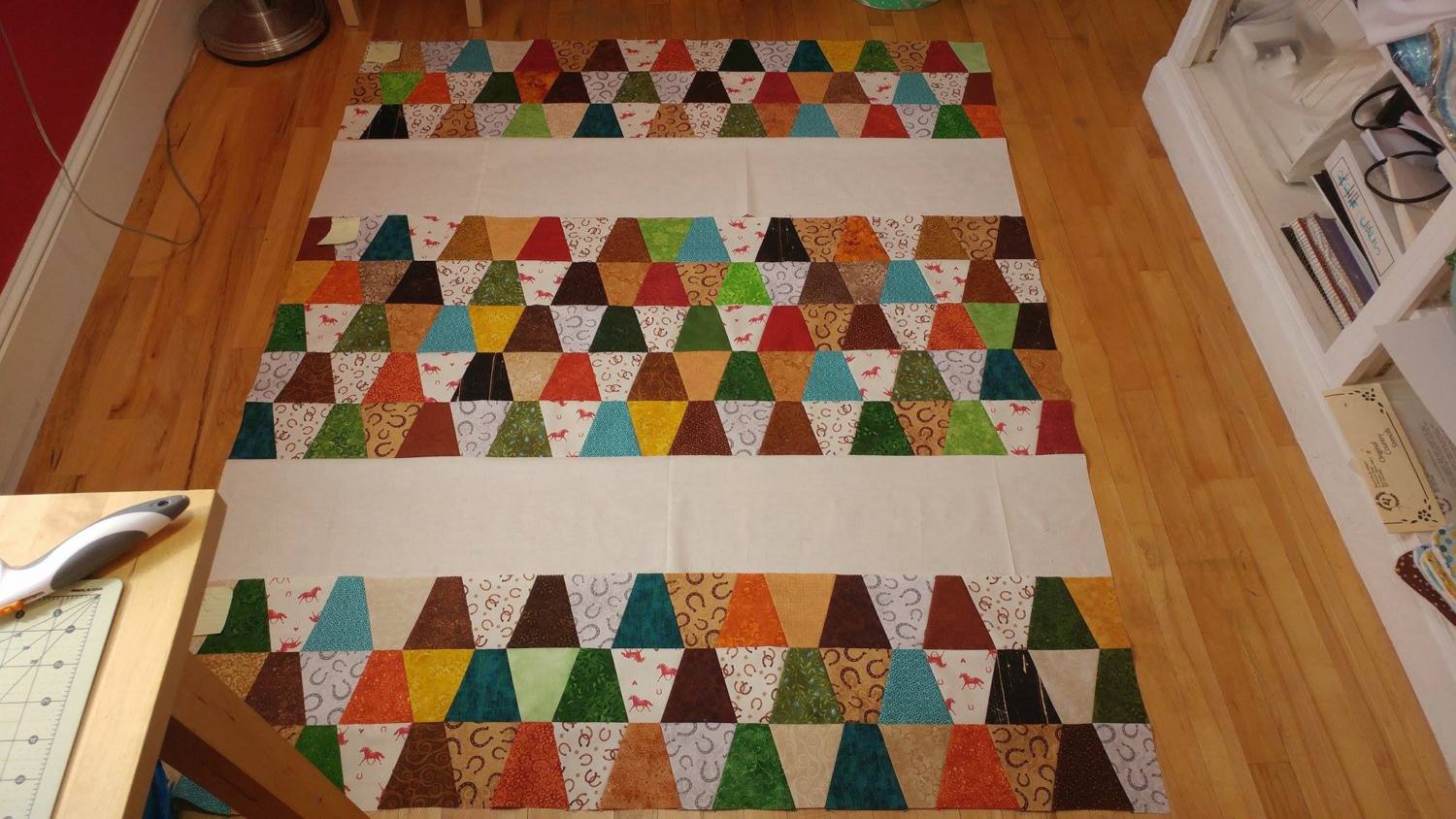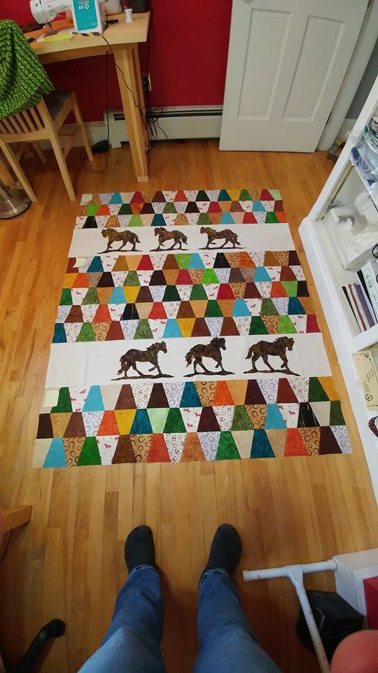 She purchased all the fabric. She actually purchased a yard of 2 fabrics that she didn't like at all once I had cut them up, so... back to the drawing board. She likes it now. The 3 horses walking were a silhouette she found on google. I blew them up and used them as templates to cut fabric out of to applique onto the white parts.