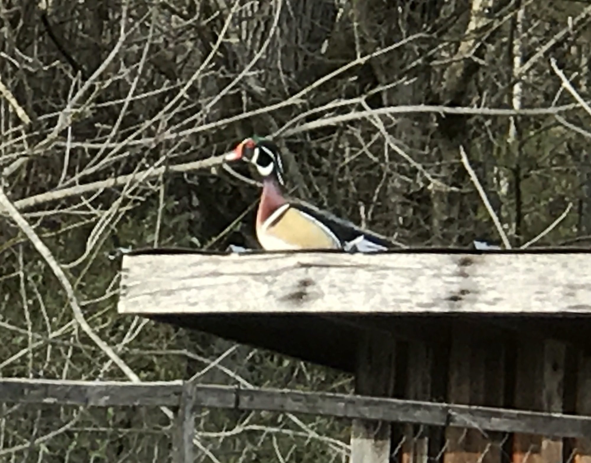 Carolina wood ducks. We found two ducklings and fostered them. Sister flew off and found a mate. Duck Duck thinks she's a chicken and goes back to the coop each night.