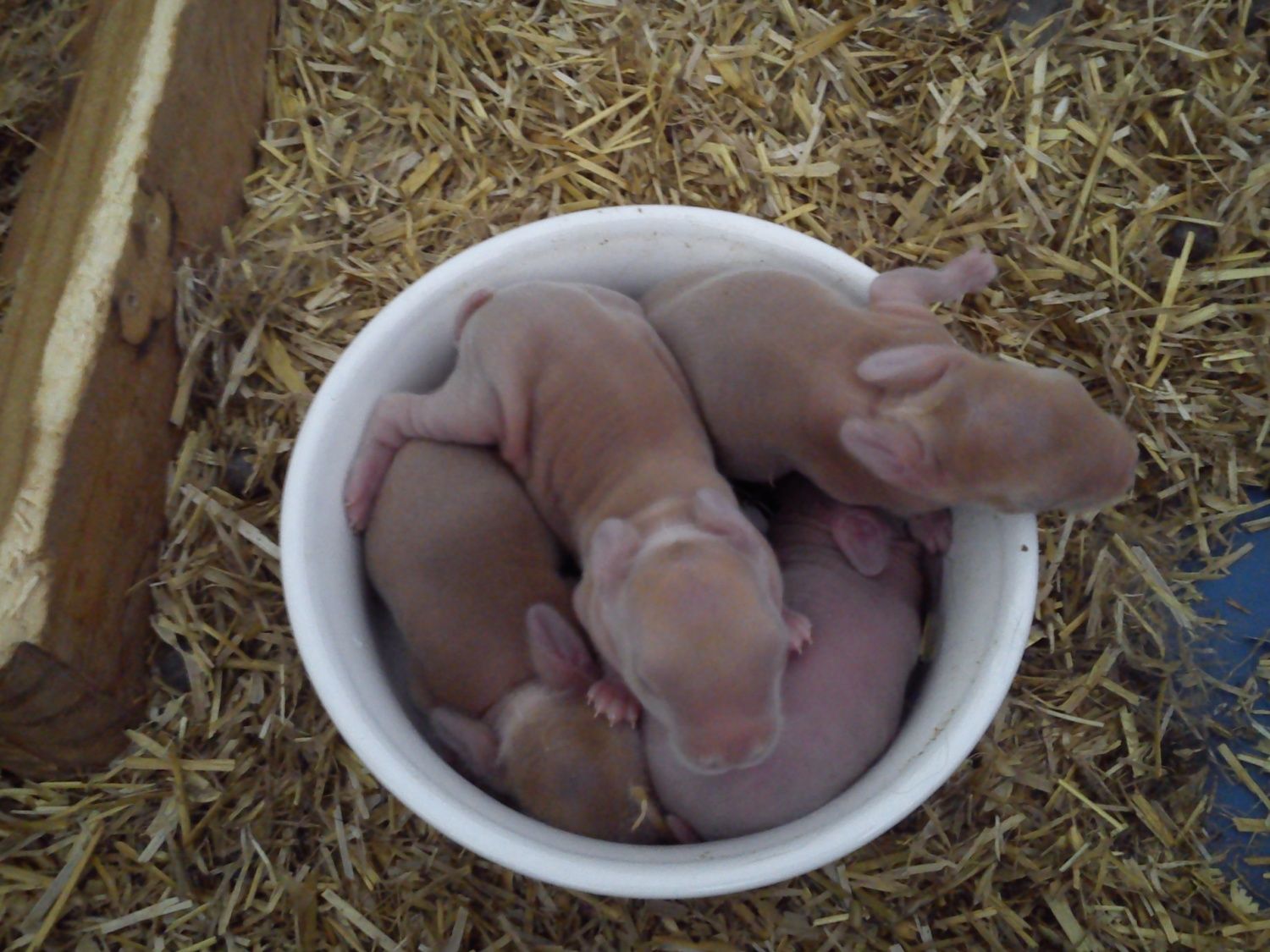 I don't get to see them pre-fured...they show up as 2-3 inch puffballs. Just had some show up last week. They survived the -29C weather and storm we had a couple of weeks ago. Amazingly tough little creatures. They would have been less than a week old when that weather hit. I'll be separating the females. I think after the next litter (which I haven't looked at yet because she had them where I can access them) that it's enough bunnies...lol.