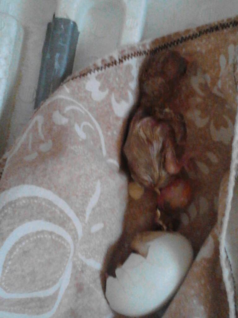 I got the baby out of the shell for the most part. It still has a good bit of yolk in the sack it has to absorb. And the sack is still attached to part of the shell. So I put all of it on a rag back in the bator to finish up the yolk! YUCK!!!! I did not want to do this part and yet here I am on my first hatch!