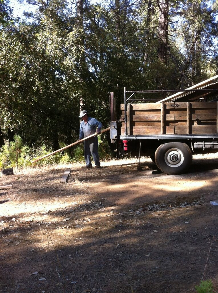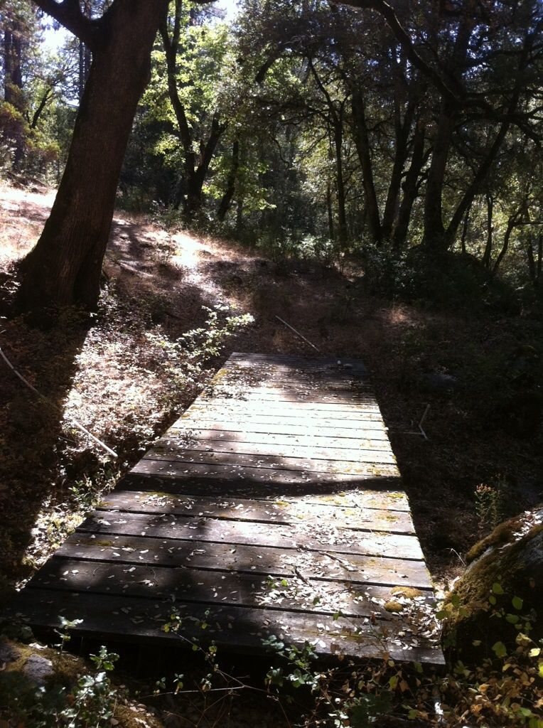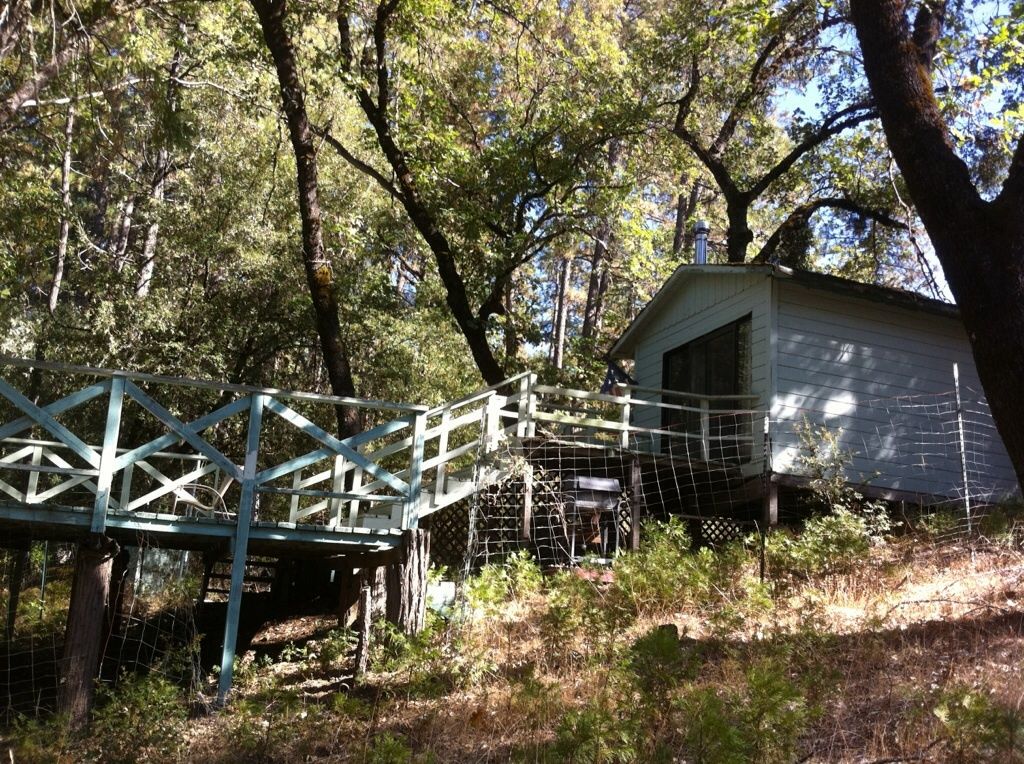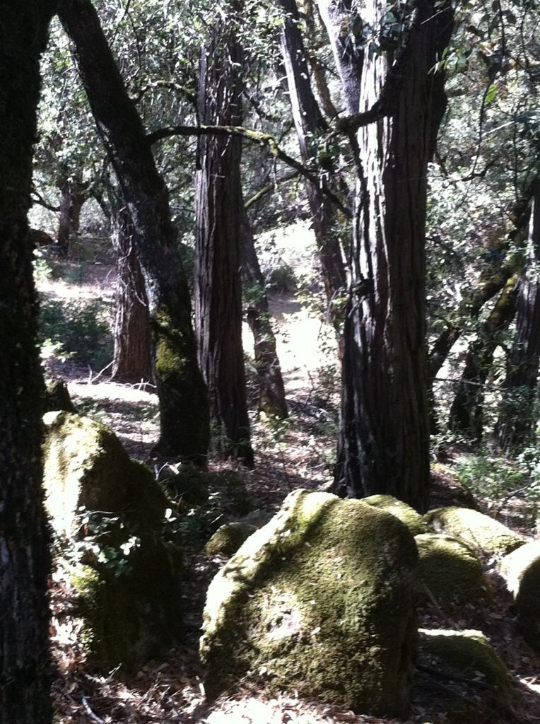 Oh, gosh, it's ALL trees, growing amongst huge boulders... Just three flat spots in the whole 8 acres. Rugged land, up and down, with Ponderosa Pine, cedar. Fir, manzanita, three types of oak, but no willow. I would love a willow tree. Way over by the cabin there is a young apple and some sort of stone fruit tree, like a peach, I think, planted by the last owners. All surrounded by more huge trees.